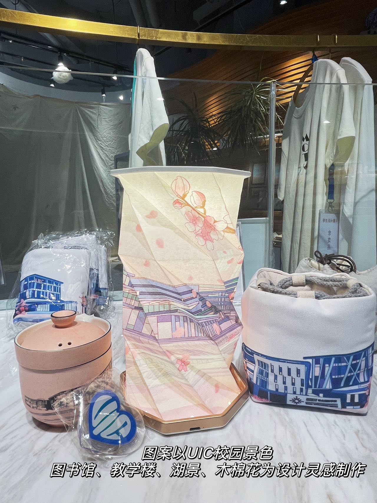 图案以BNBU校园景色:图书馆、教学楼、湖景、木棉花为设计灵感制作。