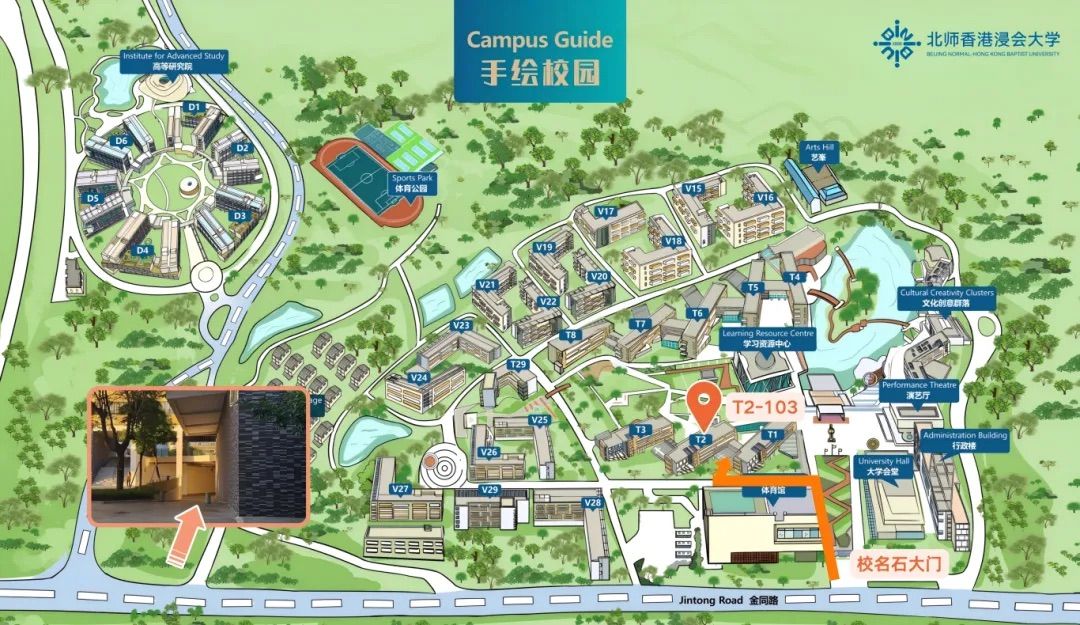 When you see the big roch with the campus name, walk straight uphill 50 m, turn left at the gymnasium, walk for 100 m more, go downhill past the T2 Humanities Building for 10 m; entrance is on the left.